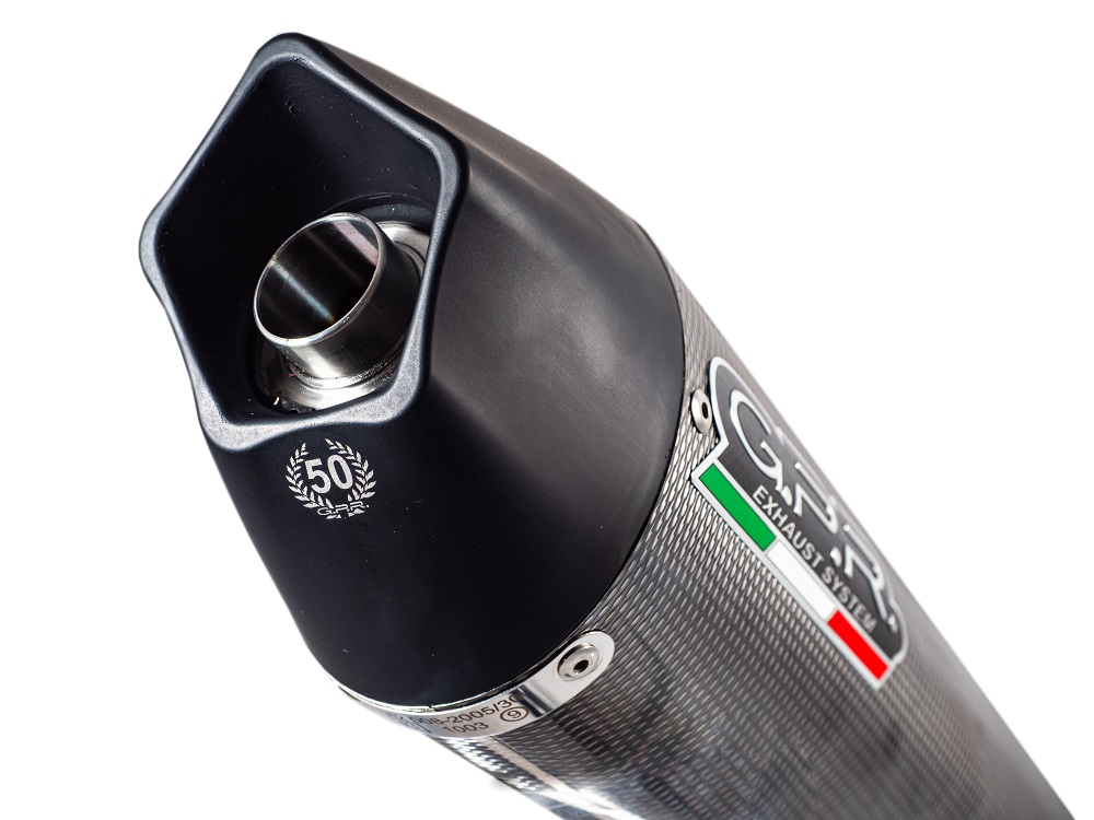 Pair Homologated slip-on exhaustGP Ann.Poppy series,born to celebrate the 50th anniversary of the brand in 2018, conical shape from round diam. 90 to oval diameter 130mm with pentagonal exit, made with carbon look stainless steel body and caps made in Avional obtained by CNC machiningOriginal GPR product, developed thanks to a long experience in World Motorbikes Championship, propose an innovative design, performance increase, relevant weight saving and a motorbike sound tone improvement.